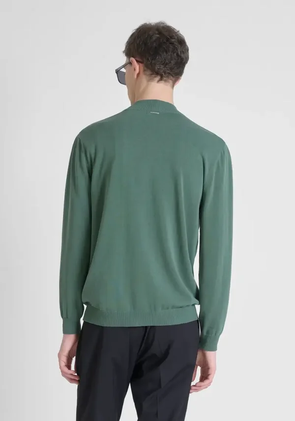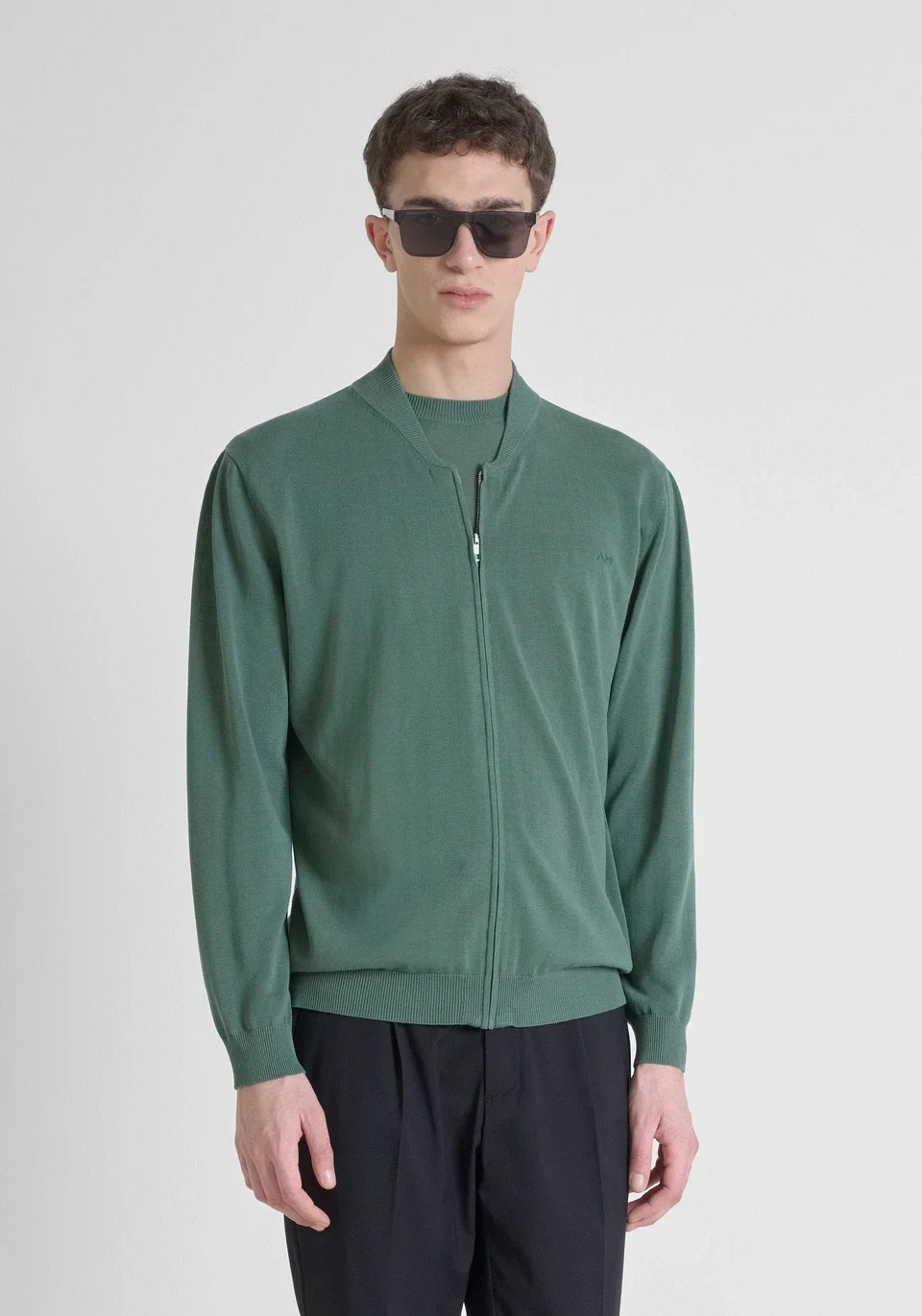 Knitted heren vest van Antony Morato in de kleur Moss Green. Het vest heeft een logo op de borst. en een rits sluiting