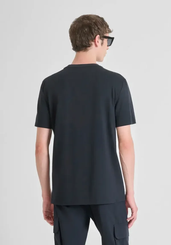 Regular fit heren T-shirt in de prachtige kleur marine. Het T-Shirt met ronde hals, gemaakt van zachte katoenen jersey. Matte print op de voorkant in contrasterende kleur met de letters van het Antony Morato-logo.