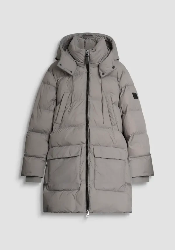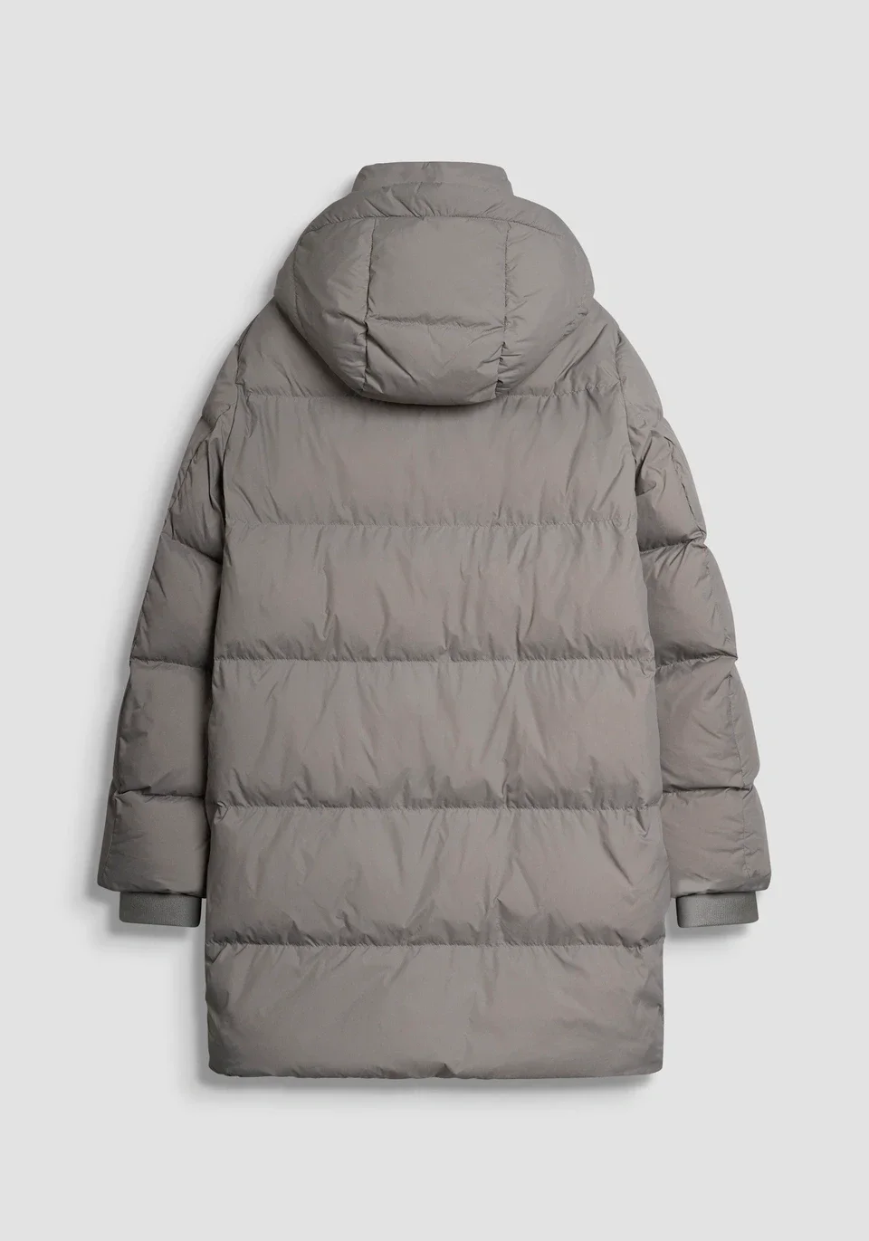 Donsjack in parka-stijl met een relaxte pasvorm en een middellange lengte, voorzien van zachte en lichtgewicht DuPont Sorona® eco-vulling, bekend om zijn hoge technische prestaties op het gebied van stretch, vormbehoud en bovenal uitstekend thermisch comfort. De stof is ontworpen voor een soepele en compacte look. Het kledingstuk heeft een afneembare capuchon, een tweewegritssluiting aan de voorkant en twee grote voorzakken met klep en knopen. Twee extra ritszakken met paspel op de borst. Elastische binnenmanchetten aan de mouwen verhogen het comfort. Een rubberen logopatch is op de mouw aangebracht. Dit donsjack is de perfecte metgezel, zelfs op de koudste dagen.
